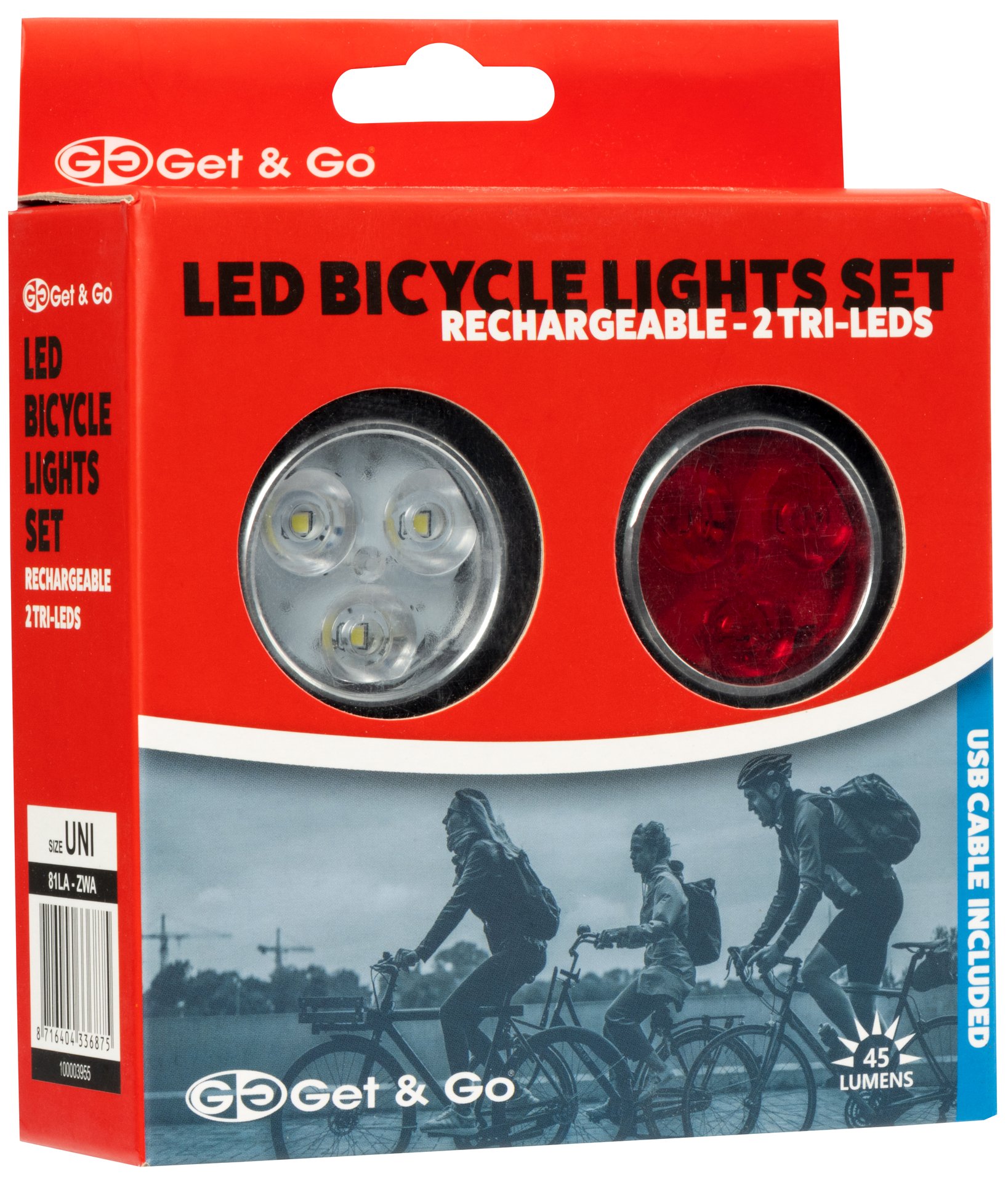 With the Tri-LED front and rear lamp set from Get & Go you will never be missing your bicycle light again! Always a clear view and no more fines for cycling without a working bicycle light. The set of lights consists of a red rear light (3 LEDs) and a bright and strong white lamp (3 LEDs) to put on the front of your bicycle. You can install the set very easily on your bicycle, for example on your handlebars or carrier. By means of the adjustable silicone mounting strap, this set fits on every bicycle and you’ll have a good lamp mounted on, for example, your mountain bike, city bike or folding bike within a few minutes and without any tools. The elastic band keeps the lighting firmly in place. Ideal when you have to cycle in the dark in the evening, or in the morning when the sun hasn’t risen yet. Also, the lights are weatherproof (IPX4) so the rain won’t harm them.