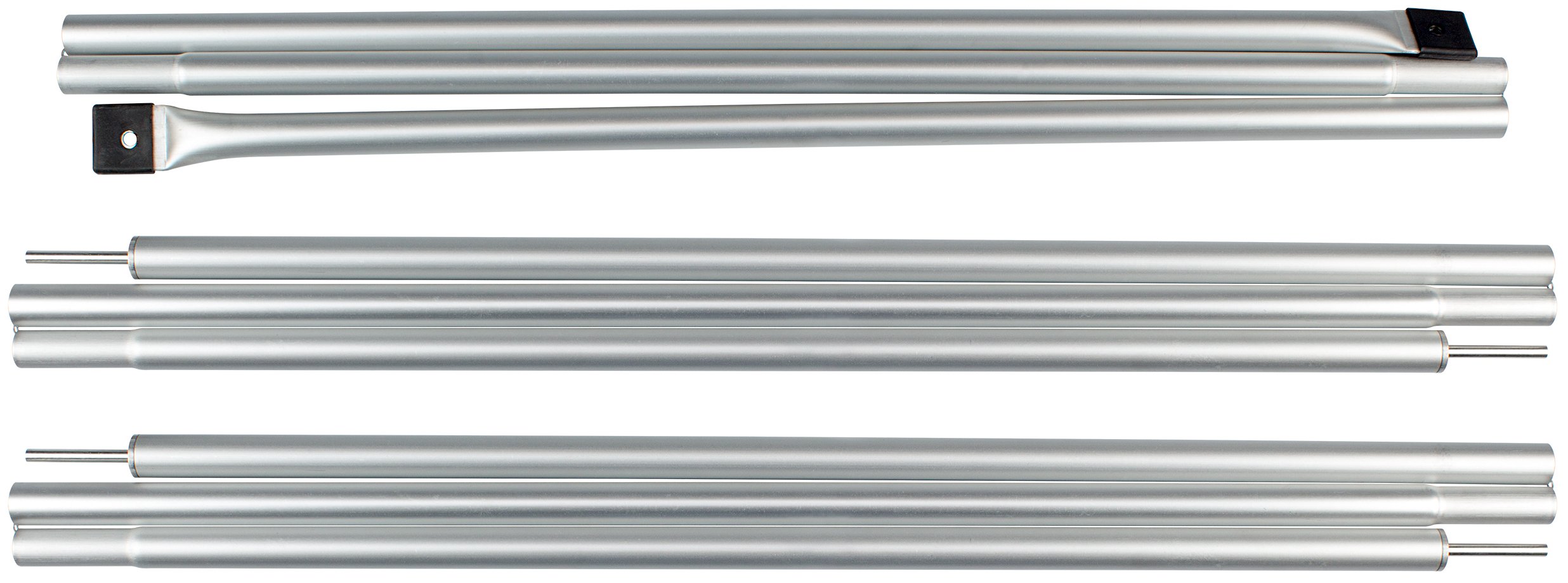 1 shelter, 2 x 3 poles, 6 guy ropes, 8 pegs, carrying bag