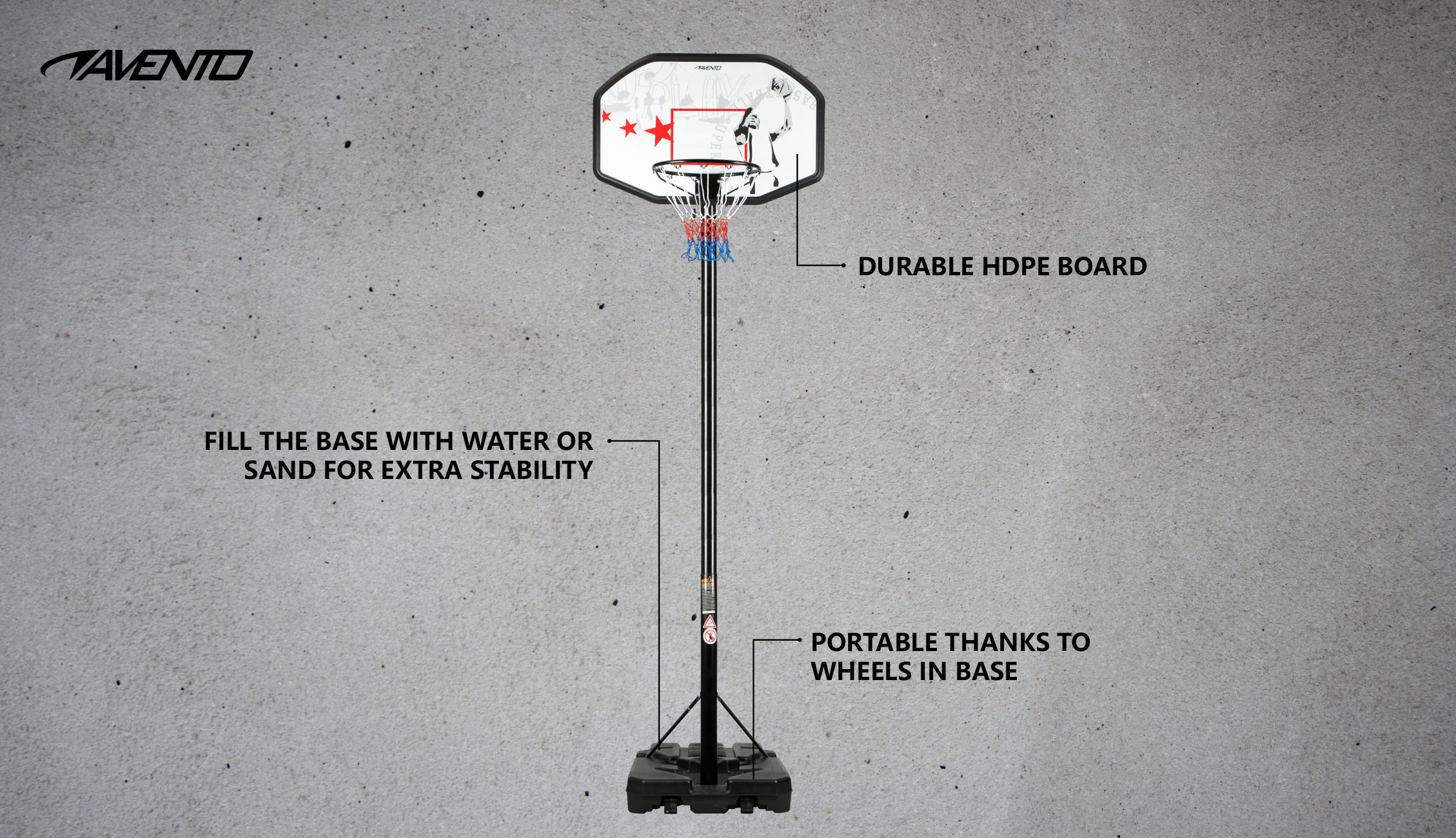 Do you also want to enjoy a nice game of basketball with your friends wherever you are? Then the Fast Break basketball stand from Avento is all you need! With this stand, you can always practice or, if you take two, challenge your friends to a fun match. The mobile stand is suitable for both indoor and outdoor use, so it is ideal for your garden or in the driveway. The stand is equipped with a basketball backboard (107 x 72 cm) with a cool print and basket with weather-resistant nylon net. The basketball hoop has a base with built-in wheels, with which you can easily move and store it, which enables you to train or play wherever you want! The plastic base can be weighed down with sand (approx. 90 kg) or water (approx. 80 kg), so that it remains stable. The sturdy foot provides extra stability and can take a beating. The height of the basket is adjustable from approx. 200 cm to a maximum of approx. 305 cm. This is also the official playing height. You can go ahead for years with this basket and play at different levels. The standard includes a manual with mounting instructions and comes without a basket ball.