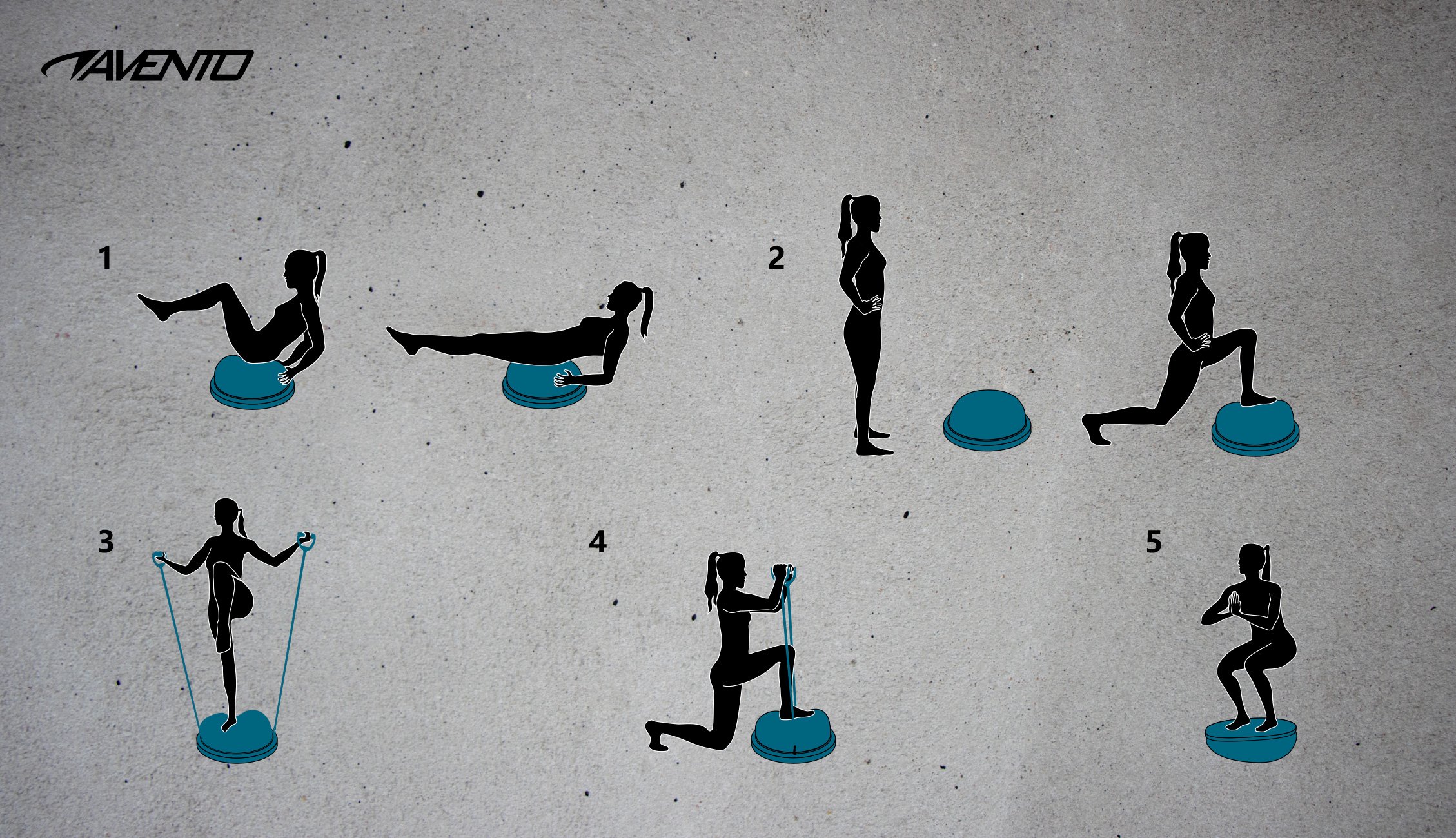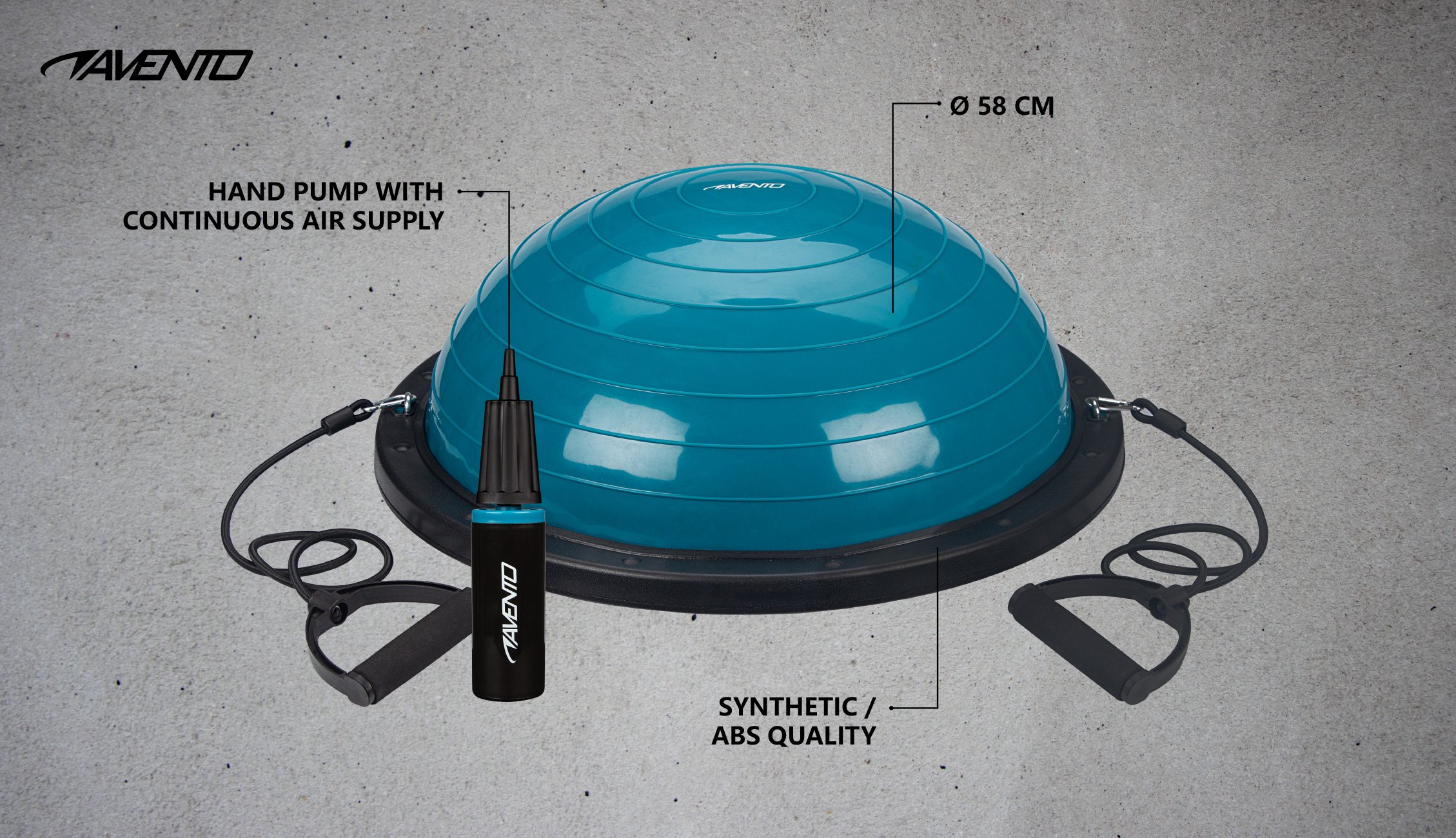 The Avento balance trainer is the ultimate way to get fit. As soon as you stand on the balance trainer, the dynamic surface challenges your balance, posture and muscle strength. With a wide range of different, challenging exercises, the balance trainer can be used for many types of training. Extend your workout even further by using the instability board with the convex side facing up and down. Strengthen various muscles in the body, including the core muscles, which are located in the abdomen and back, improving your strength and balance. This balance hemisphere is widely used by athletes, personal trainers and physiotherapists. The Avento balance ball disc comes with removable resistance bands, with which you can also train your arms and shoulders. The balance trainer can be easily inflated with the supplied pump. The balance trainer is suitable for a maximum of approx. 100 kg.