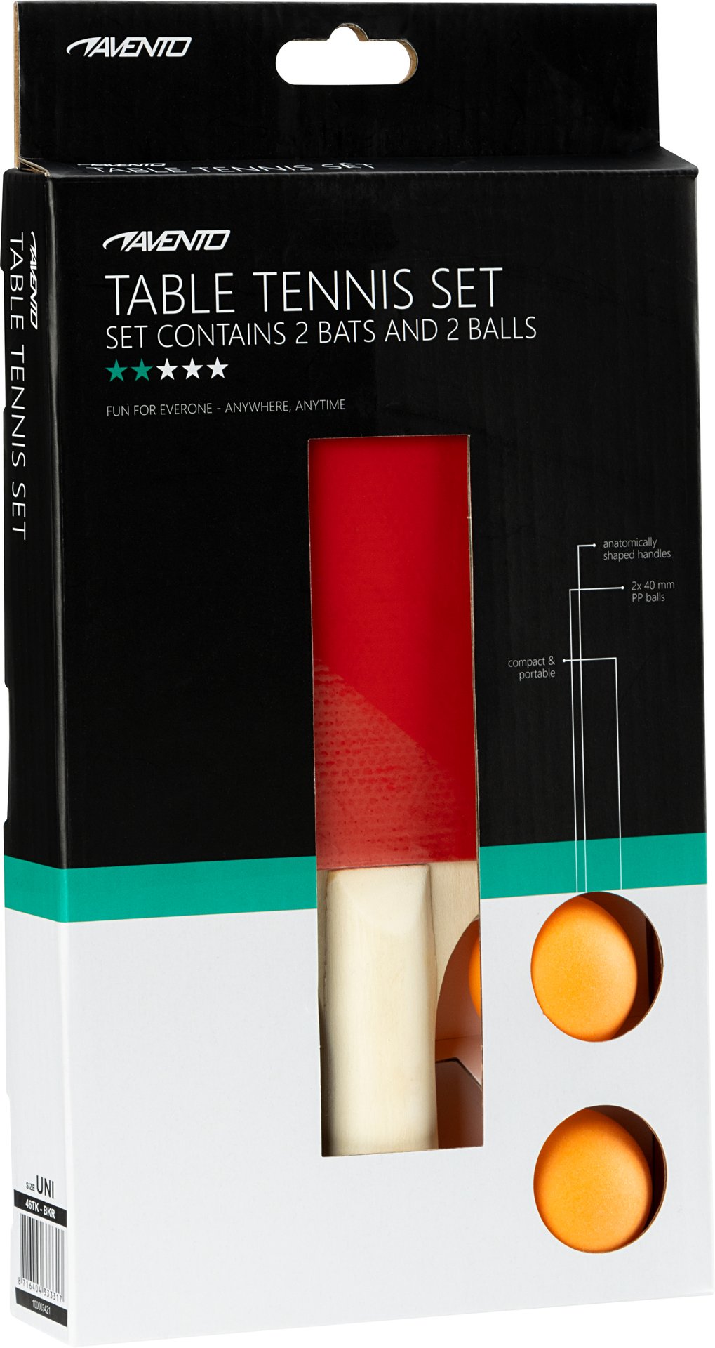Beat your friends around the table with the Avento table tennis set. The ping-pong set is perfect for both at home and on vacation. The versatile table tennis bats in this set are made of five layers of wood. This ensures that the bats are extremely sturdy and can take a beating. The ping-pong bats have an atomically-shaped handles for a good grip, so you can easily go from the forehand to the backhand while playing. The blade of the bats has a rubber top and bottom layer, for good control of the ball. This set comes with two bats and two ping pong balls. The ping pong balls have a diameter of 40 mm and they have a good visibility because of their bright orange colour. For instance when you are playing on a blue table tennis table.