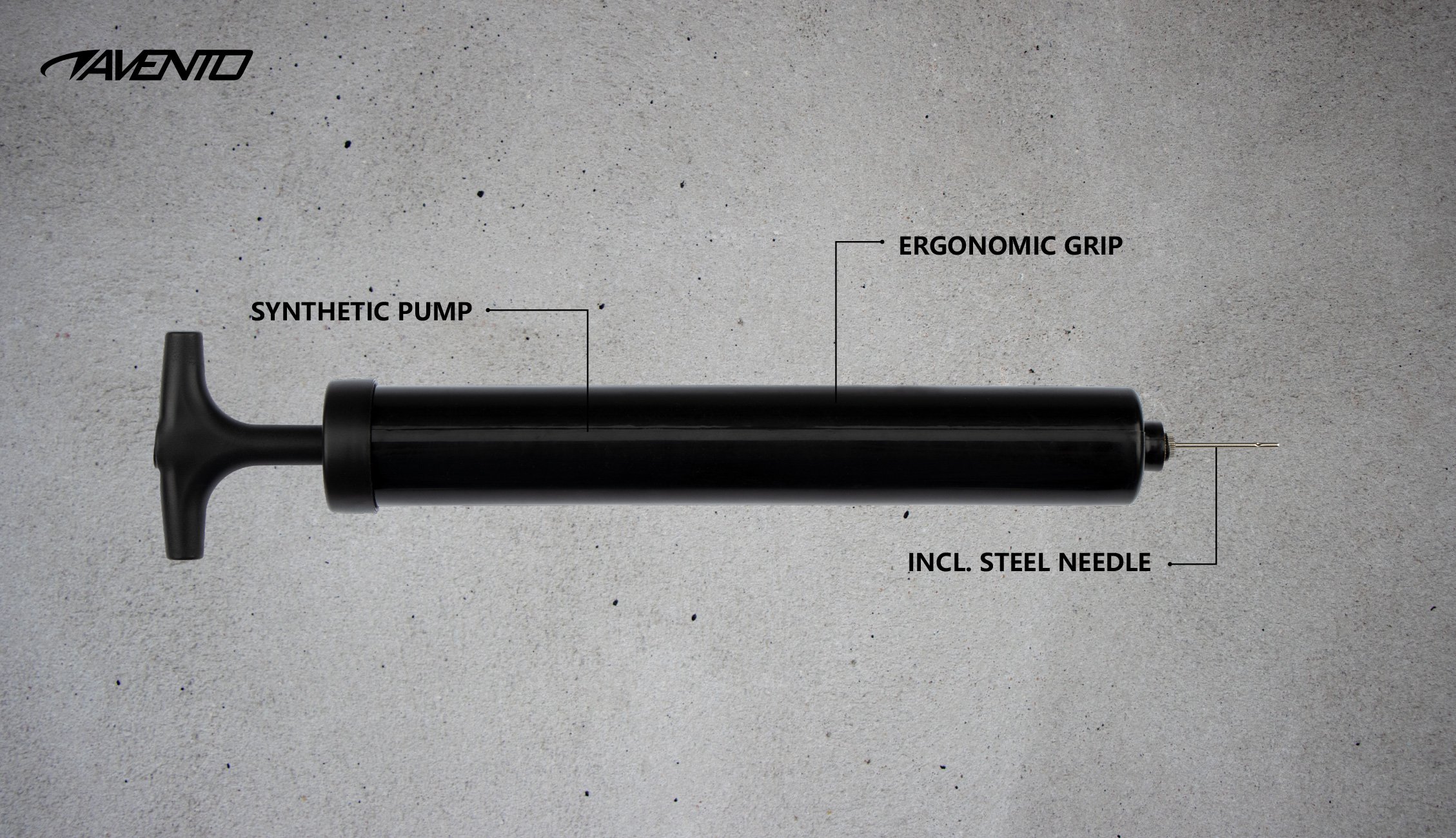 Handy plastic ball pump with sturdy steel needle. With this Avento pump you can get back to playing football, volleyball and basketball again in no time!