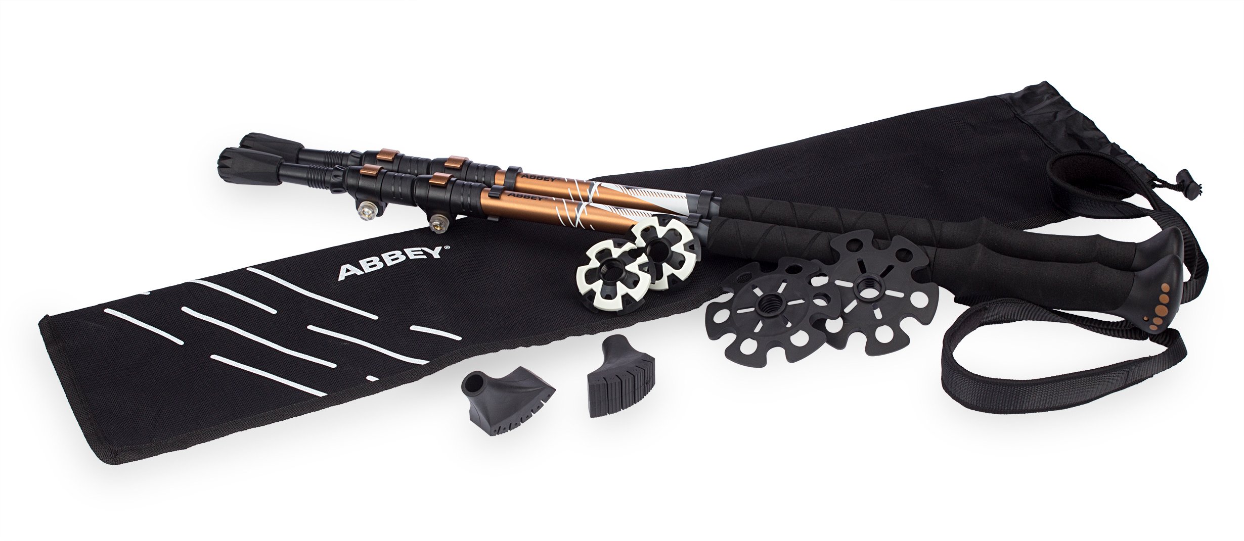 2 walking canes, 2 snow baskets, 2 trekking discs, 2 Nordic walking tips, carry bag, instructions