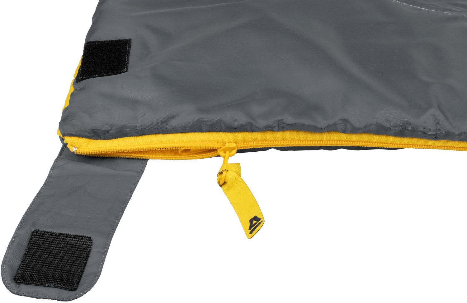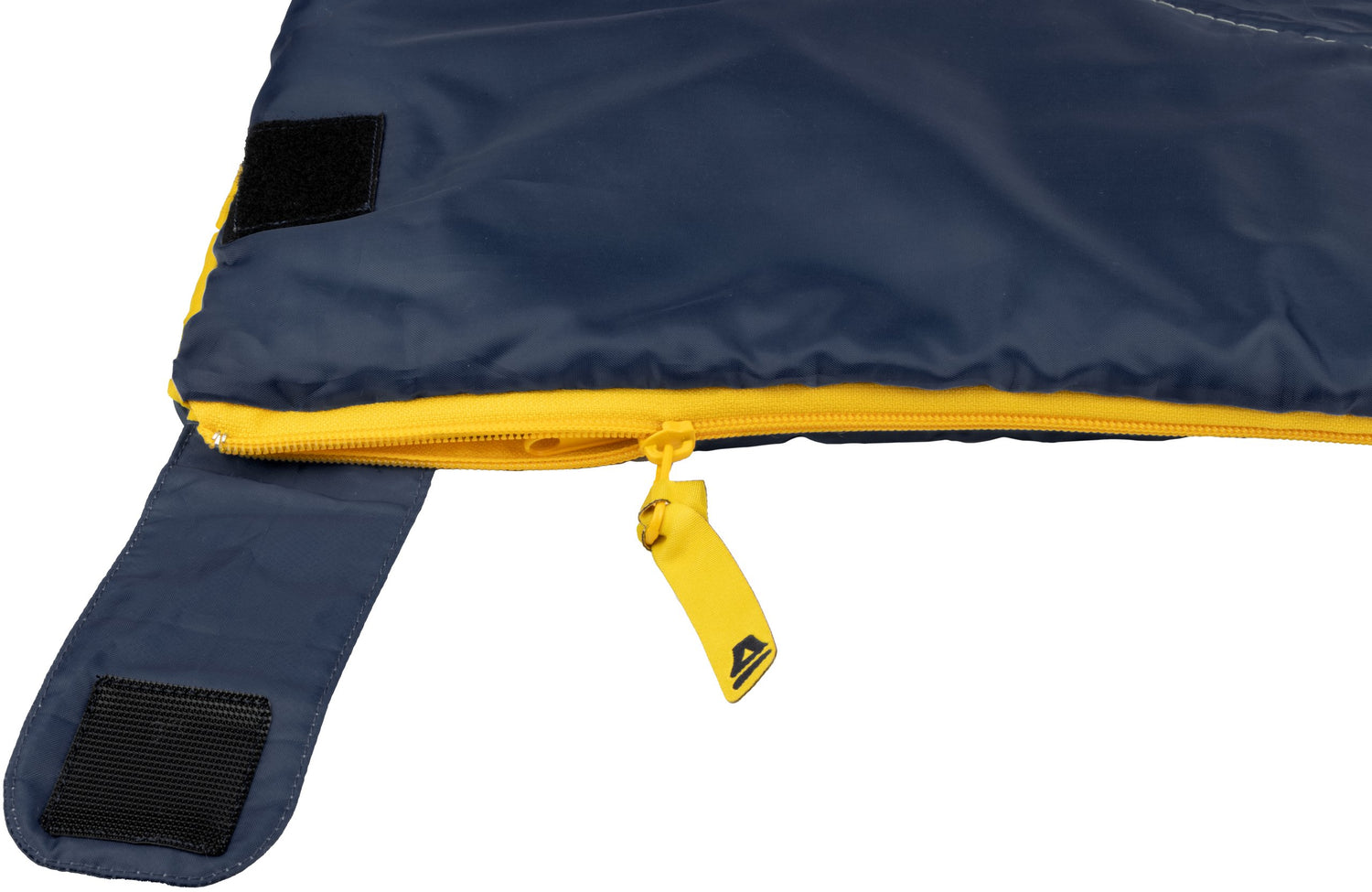 Soveposen har en solid glidelås og er utstyrt med borrelåslukking øverst. Dette beskytter ikke bare glidelåsen, men også huden din mens du sover. Langs glidelåsen går en trekkbeskyttelse som sørger for at du ikke blir plaget av trekk, og at glidelåsen ikke gnisser mot deg. Mye mer behagelig!