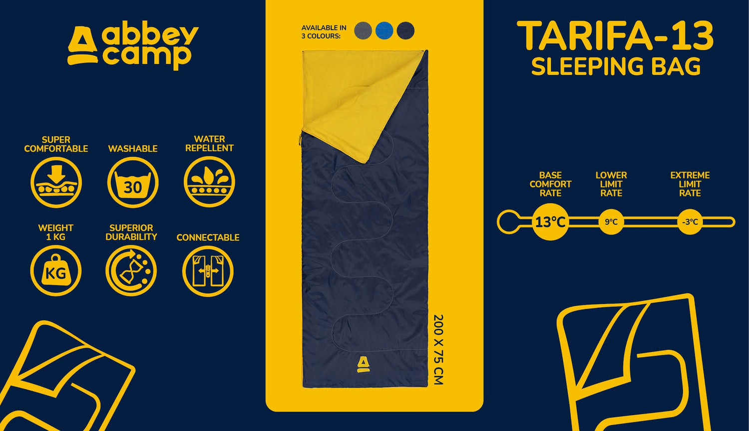 Leter du etter en lett og behagelig sommersovepose for varmere temperaturer? Abbey Camp Tarifa soveposen er en trivelig teppeaktig sovepose som gir god isolasjon samtidig som den er luftig. Enten du skal på camping, overnatte hos venner eller dra på festival, sikrer denne soveposen en god natts søvn.