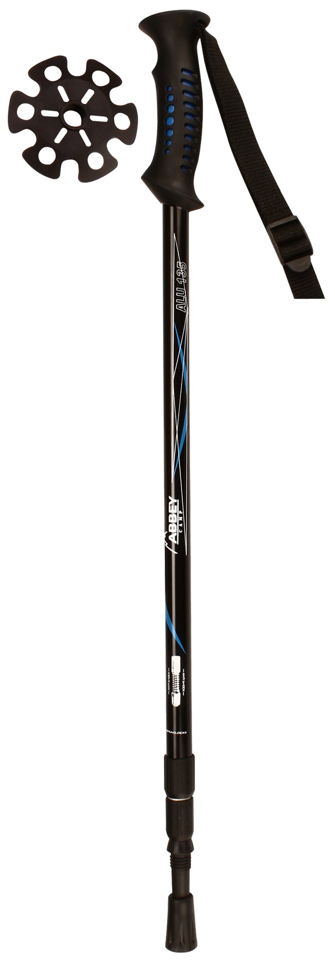 I tillegg har vandrestaven et anatomisk formet gummigrep med svart håndleddsrem, som er viktig for støtte og effektivt skyv. Staven leveres med en slitesterk ståltupp.