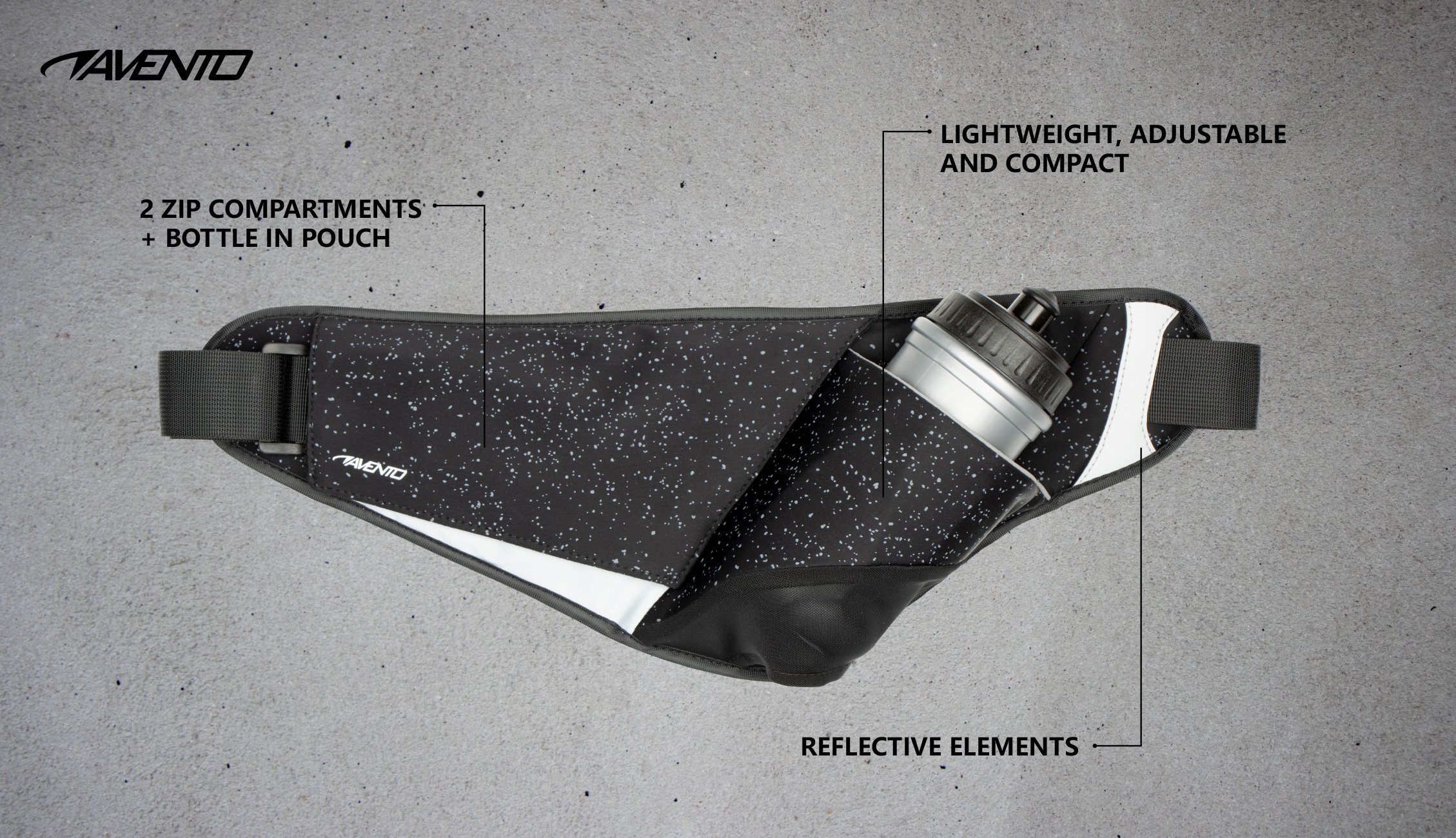 Når det er viktig å drikke nok væske, men du trenger å bære så lite som mulig, tilbyr Avento Alex hofteveske med drikkeflaske den perfekte løsningen. Magevesken er laget av vannavvisende nylon med ventilerende netting, og hele vesken har reflekterende detaljer for ekstra sikkerhet. Ved siden av flaskeholderen er det to oppbevaringsrom med glidelås – praktiske for nøkler, smarttelefon, energibarer osv. Hoftebeltet er justerbart og har trykknapplukking. Drikkeflasken (ca. 0,5 liter) er inkludert.