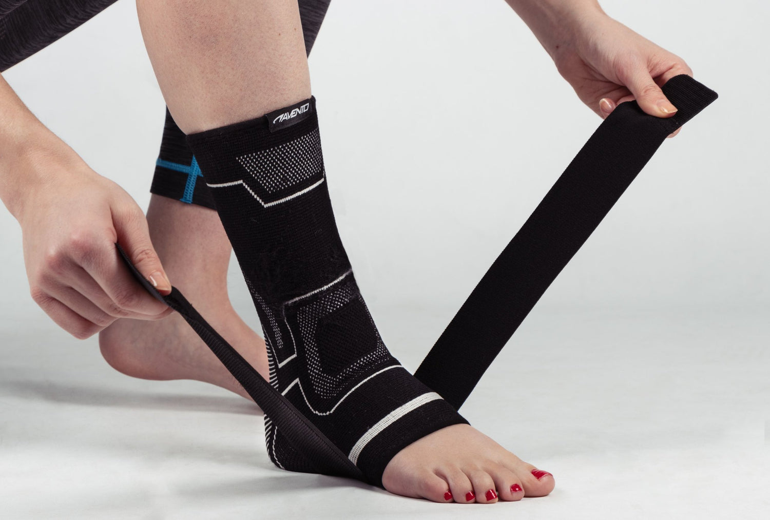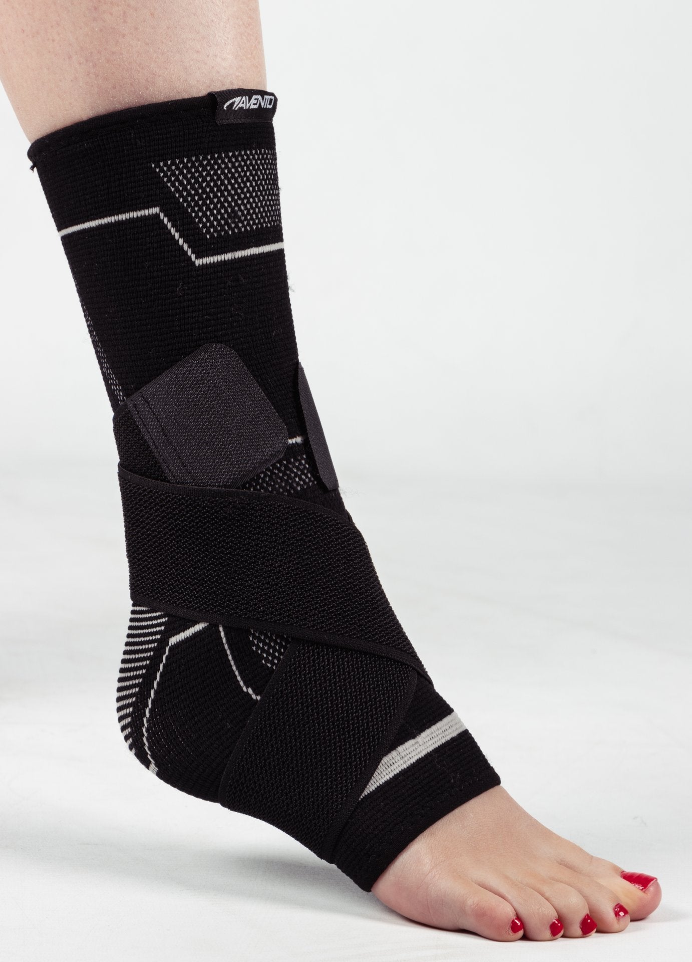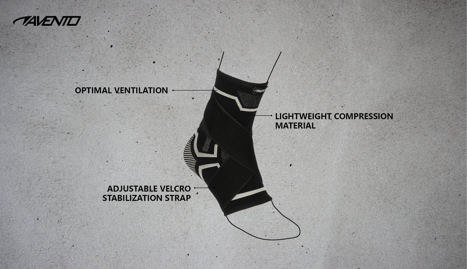 Den komplette fotstøtten er laget av elastisk materiale, som gir en behagelig følelse under bruk. De to justerbare stabiliseringsstroppene sørger for at kompresjonen kan tilpasses individuelt. De elastiske stroppene som kan vikles rundt ankelen, stabiliserer leddet og gir fast kompresjon. Ankelstøtten er laget av pustende materiale som raskt transporterer bort svette og ikke holder på fuktighet. I tillegg kan ankelstøtten vaskes i maskin.